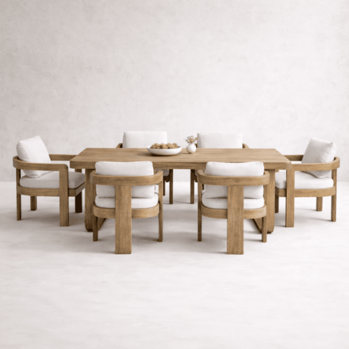 The Bantam Set is among the best outdoor furniture collections available in Cairo and across Egypt, designed to bring elegance and comfort to your patio, garden, or poolside. This stunning set includes a 3-seater outdoor sofa, two outdoor chairs, an ottoman, chaise lounge, coffee table, and two side tables, crafted from natural beech wood with handwoven seagrass rope accents and upholstered in premium waterproof fabric.