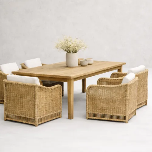 To maintain your furniture's longevity, avoid dragging it on the ground and do not allow water to stand on surfaces. Use covers for protection when not in use for extended periods. Clean regularly with a soft towel and mild soap. Avoid harsh cleaners. For water spots, use a vinegar and water solution, rinse well, and dry with a soft cloth.