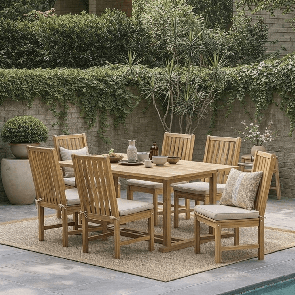 The Pétain Dining Set transforms indoor dining with its blend of sophistication and practicality. Its robust beech wood frame complements any interior, from modern to traditional, while the waterproof fabric ensures durability in busy households.