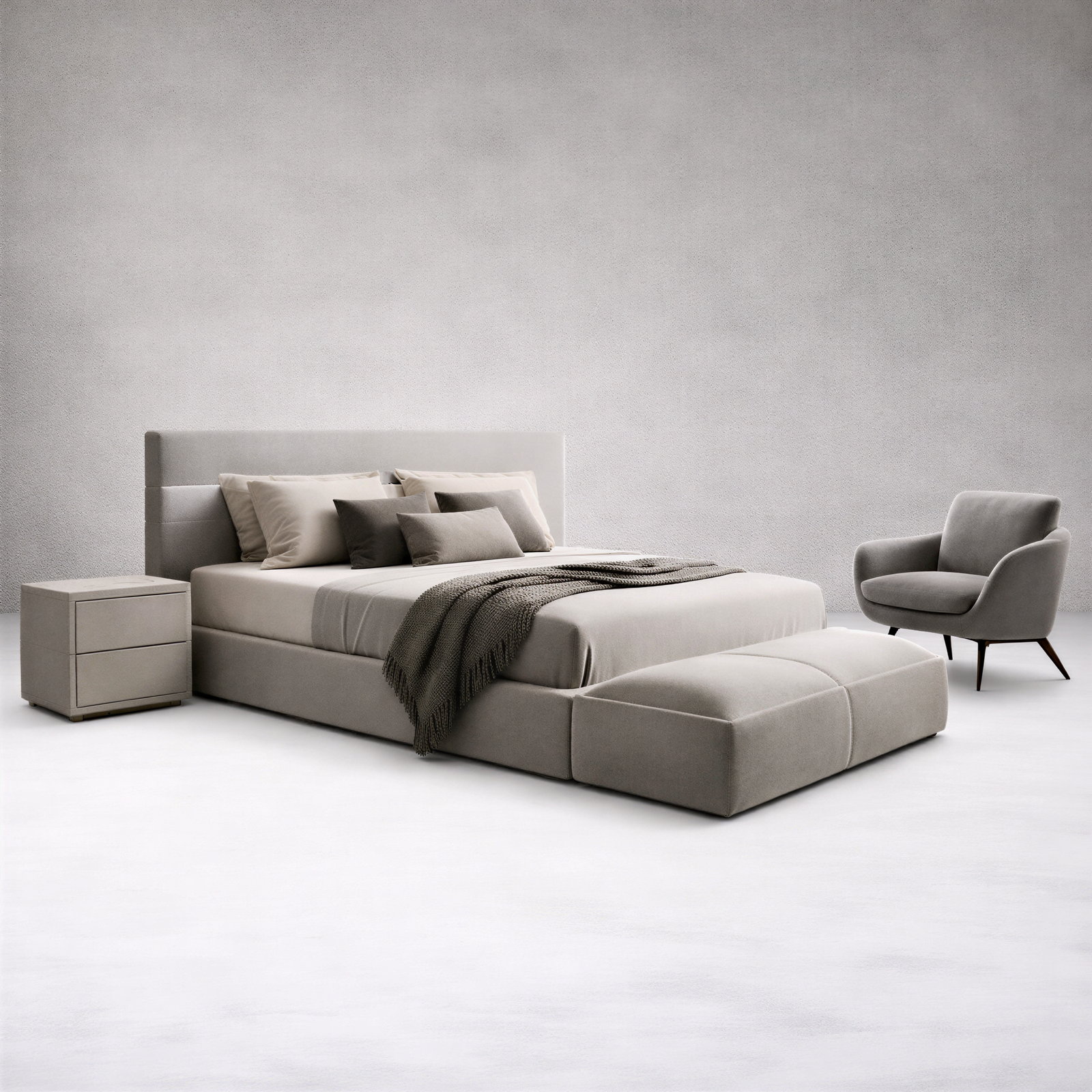 | Dimensions | Bed: L 200cm x H 30cm x W 120 – 160 -180 cm Head board: W 220cm – 260cm – 280cm x H 110cm Bedside: W 45cm x D 45cm x H 50cm Chair: W 75cm x D 70cm x H 85cm Bench: L 150 – 170cm x W 65cm x H 30cm |