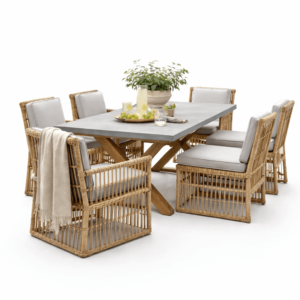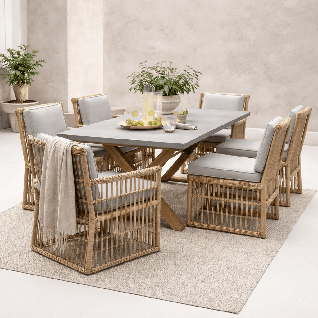 Blending natural charm with durable craftsmanship, the Roca Dining Set is the perfect addition to any garden, patio, or terrace. Designed for style and function, this outdoor dining furniture set features a spacious outdoor dining table, two armchairs, and four chairs—ideal for entertaining or family meals.