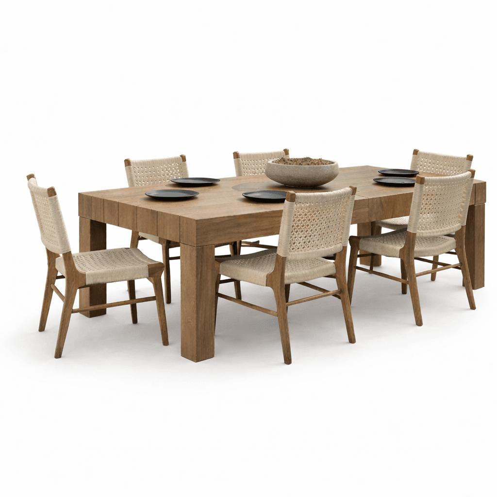 The Stoffa Dining Set represents the ultimate in luxury outdoor dining, offering an expansive 220cm table with six elegant chairs – all crafted from premium natural beech wood with sophisticated rope detailing. Designed specifically for Egypt’s climate, this collection combines generous proportions with timeless design for unforgettable outdoor entertaining.