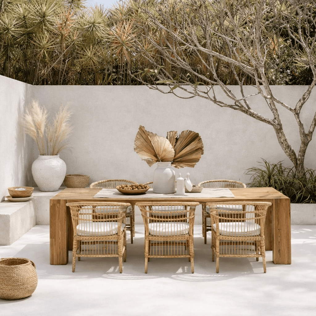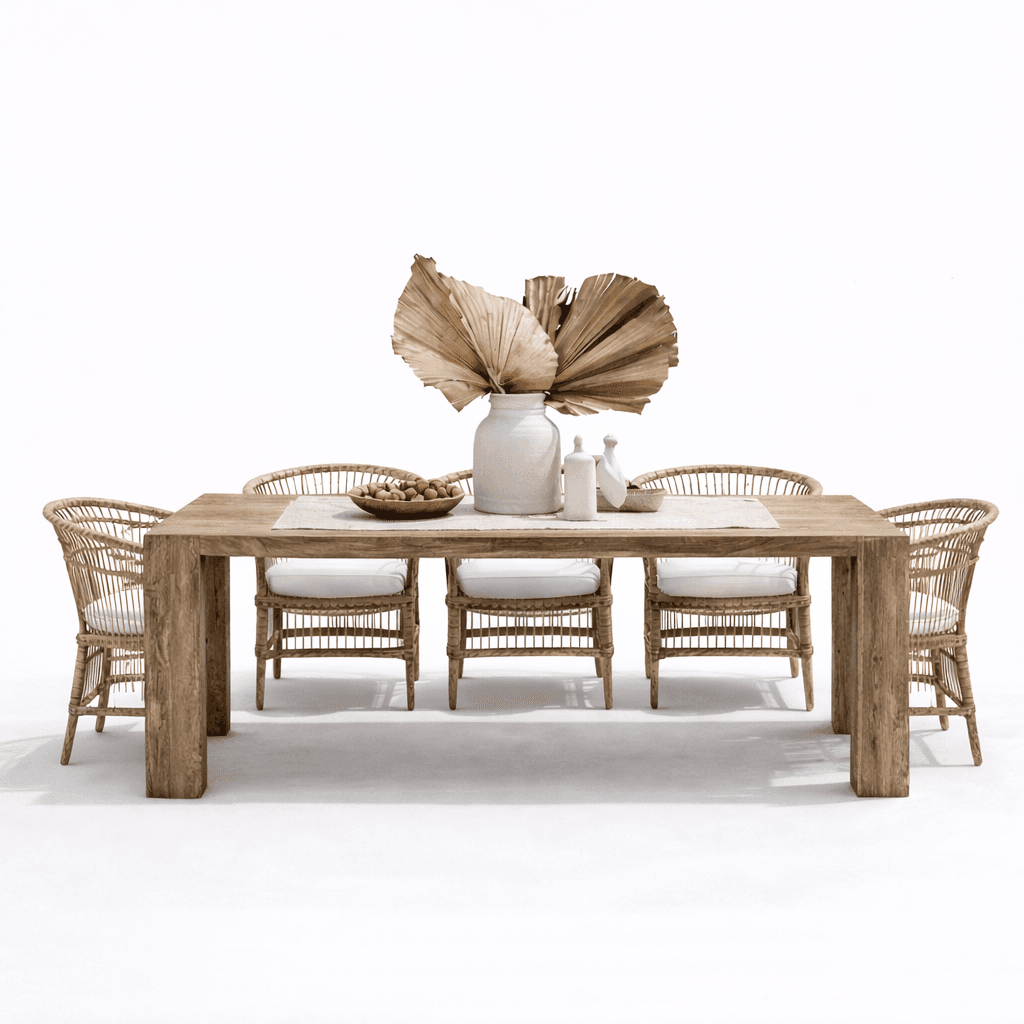Crafted from a refined blend of bamboo, natural beech wood, pitch pine wood, and teak wood, this set offers natural charm and long-lasting strength. Whether you’re creating an outdoor dining menu for brunches or sunset dinners, the Toplama set delivers a luxurious yet practical solution. Each chair includes a waterproof cushion to ensure comfort and weather resistance, making it perfect for year-round use.